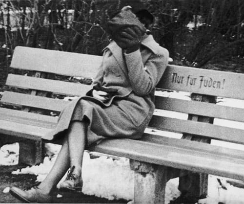 A Jewish woman who is concealing her face sits on a park bench marked “Only for Jews”, 1938