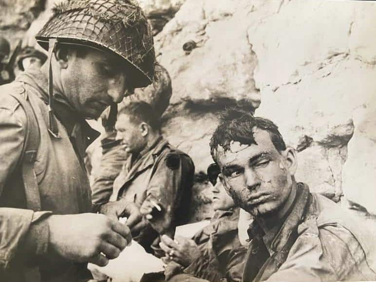 “The Face of a Modern Crusader- with his hair matted and grit and determination stamped all over his face, an American soldier, injured while landing on a beachhead on the northern coast of France, has his hand bandaged by an American medical officer” June 6, 1944.
