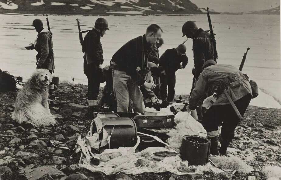 U.S. and Danish personnel examine equipment left behind on Greenland by Germans when they fled under U.S. attack during World War II (1943)