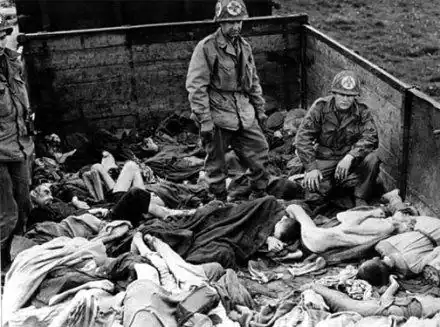 American soldiers in one of 40 carriages, containing a total of over 2.000 dead. (Dachau, 26th of April 1945)Concentration camp inmates