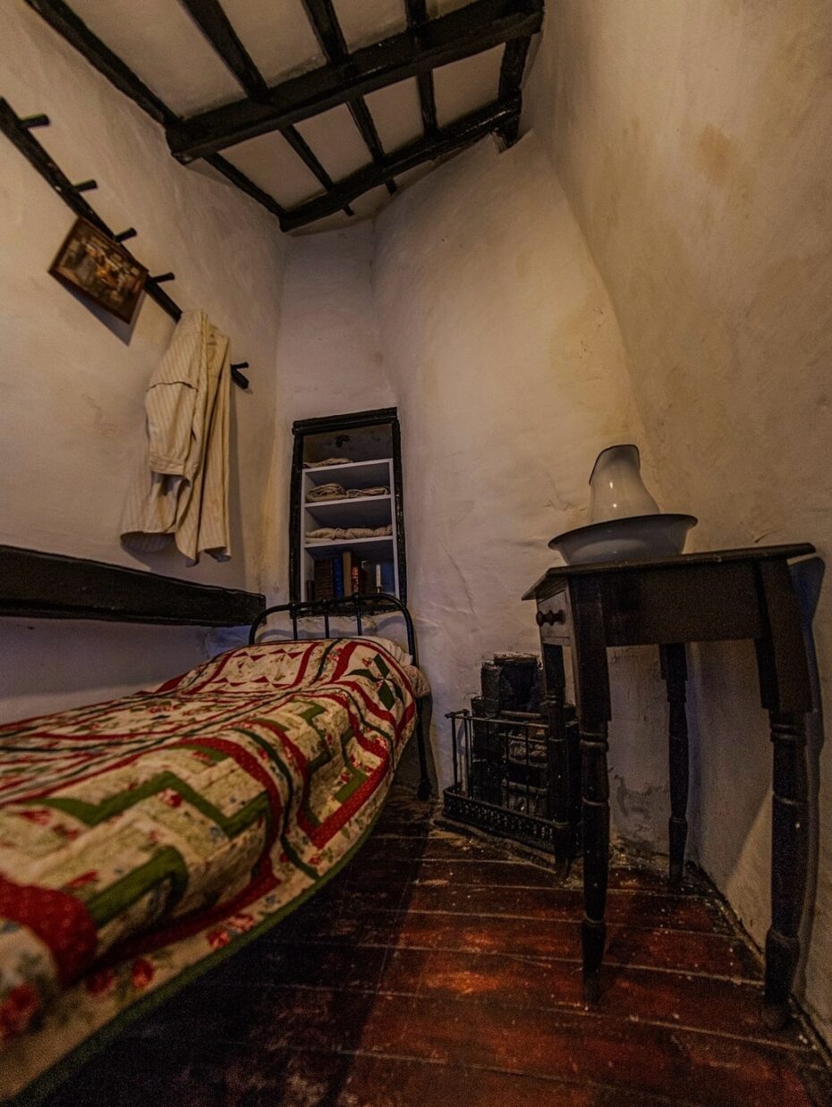 The ground floor features a small open fire, a built in wooden bench, and a water tap tucked behind the stairs. The stairs then takes you to a tiny bedroom, just large enough for a single bed and a small niche for storage.