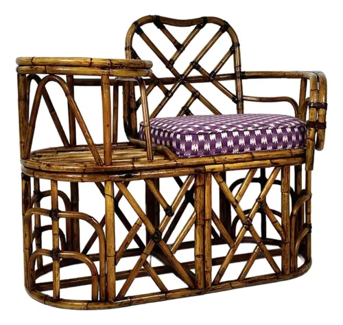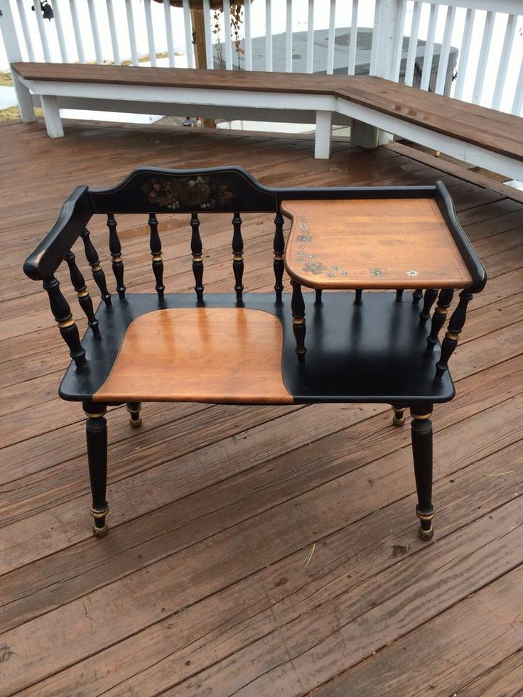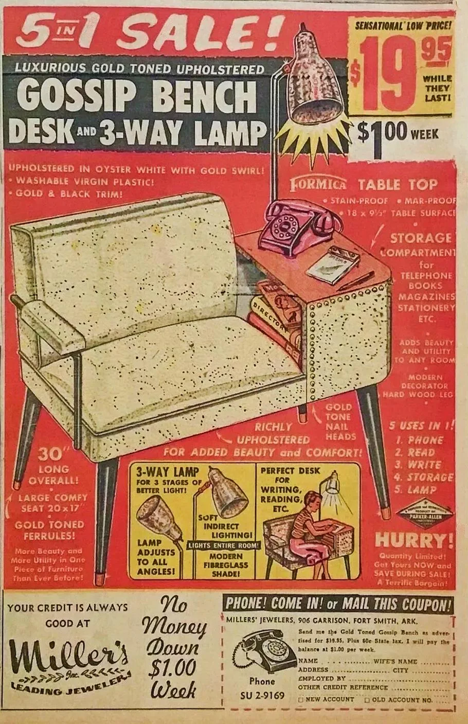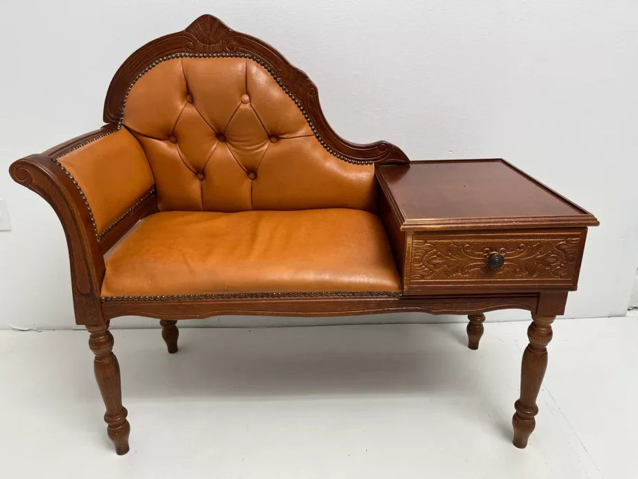 Most popular from the 1930s through the 1950s, gossip benches were comprised of a seat attached to a small table that held the telephone itself and sometimes a lamp or notebook. Most also featured a storage cubby or drawer to hold a phone book, since the directory was also large and not easily moved around but necessary to keep close at hand in order to look up telephone numbers.