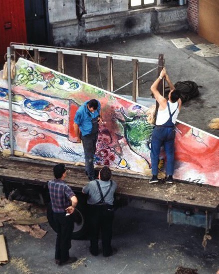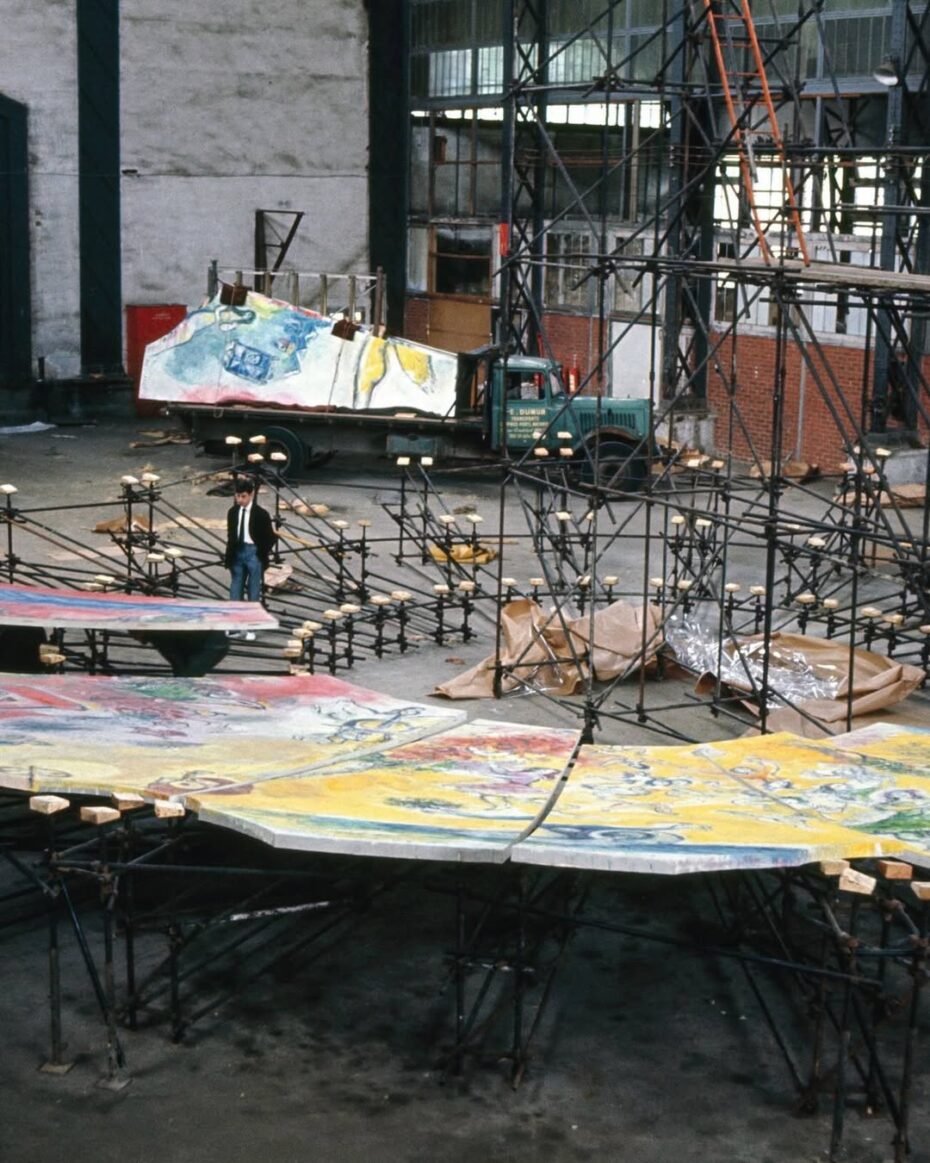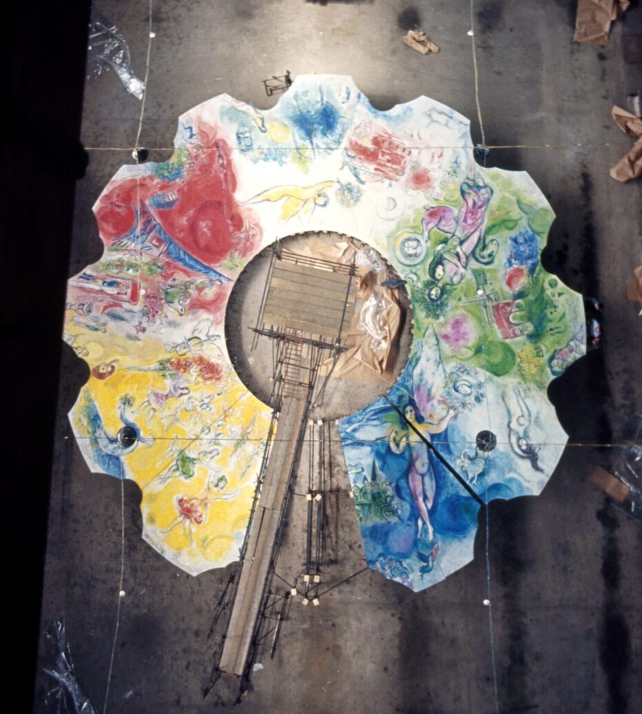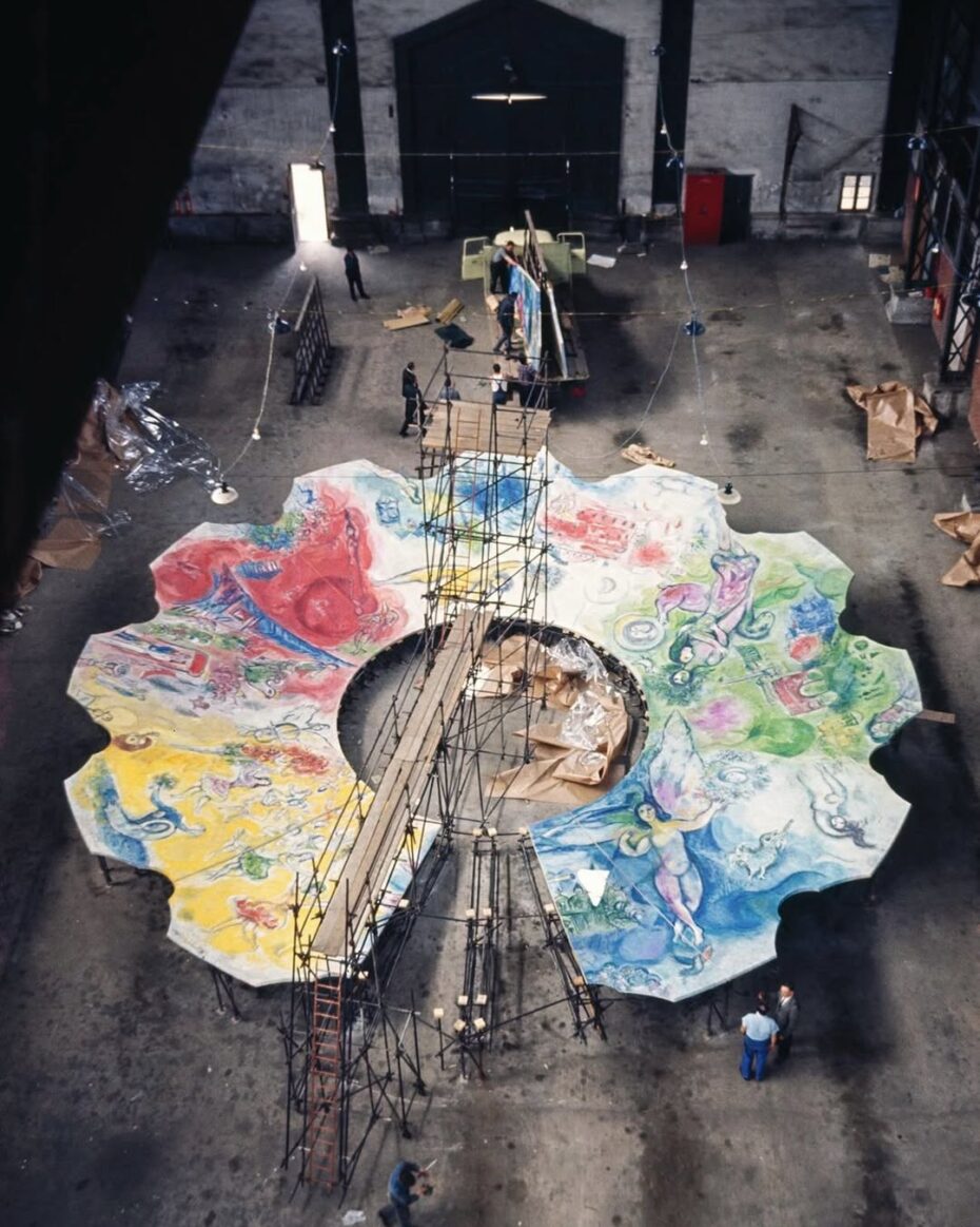 On August 7, 1964, inside Hangar Y, (formerly the Chalais Meudon site where the world’s first airship hangar was built in the 1870s and is now an excellent art & culture museum in the suburbs of Paris) artistr Marc Chagall used the nave’s space to assemble his 220 square meters of canvases that would adorn the red and gold vault of the Opéra Garnier’s auditorium. The panels were mounted on a frame, just before the canvas was glued to the walls.