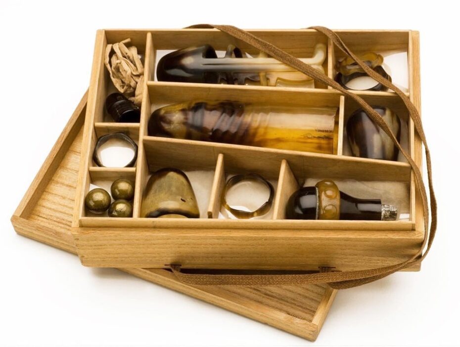 Made in Japan by the Arita Drug and Rubber Goods Co., in Kobe, Japan, with 10 compartments containing four phallus sheaths, four phallus rings, three brass balls, one d*ldo and one finger sheath!