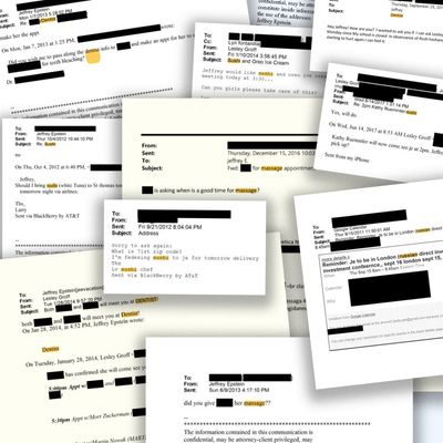 In another email, from 2013, Hoffman tells Epstein that “beef jerky” is one of “many threads for our next call.” (The others are: “planes. charity, mapping orthogonal dimensions.”) There are 380 mentions in the files of “jerky,” which was apparently one of Epstein’s favorite foods (though some wide-eyed online theorists have suggested it’s really a code word for cannibalism). There’s a lot of jerky-related correspondence from chef Francis Derby, who according to the files worked as Epstein’s private cook, made trips to Little Saint James, and spoke with other Epstein associates about making, supplying, and storing large amounts of jerky.
