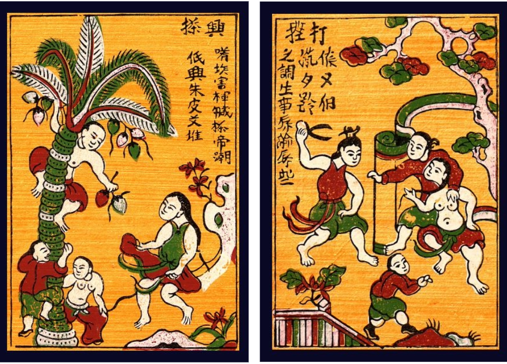 Often used to illustrate Vietnamese New Year, Ðông Hồ paintings are bright, witty riffs on society and human desire. The traditional themes of Đông Hồ painting and woodblock prints are good luck signs, historical figures, folk allegories, popular stories, and social commentaries. In a similar way to Mexican calaveras, Ðông Hồ painting lampoon the mighty and celebrate the everyday.